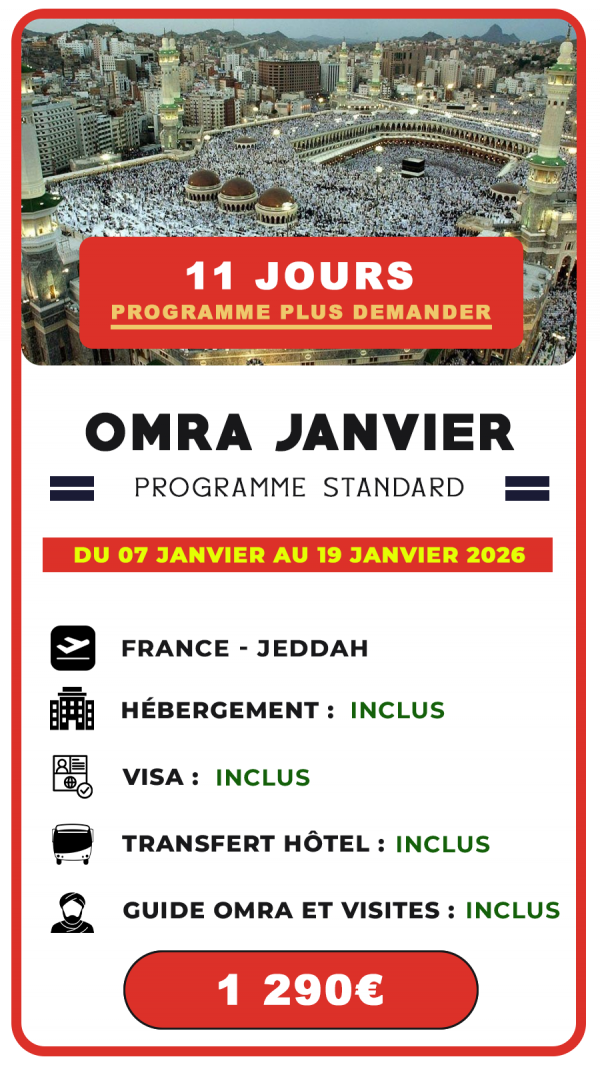 Pour le mois de janvier 2026, nous vous proposons deux formules Omra spécialement adaptées à vos besoins, alliant confort, accessibilité et accompagnement spirituel complet.